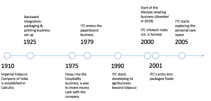 ITC’s roots go back a century. It was incorporated as Imperial Tobacco Company of India in 1910 and for the first 6 decades of its existence, it was devoted to growing and consolidating its cigarette and leaf tobacco business.
