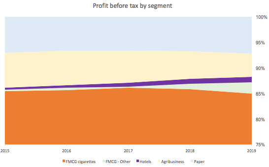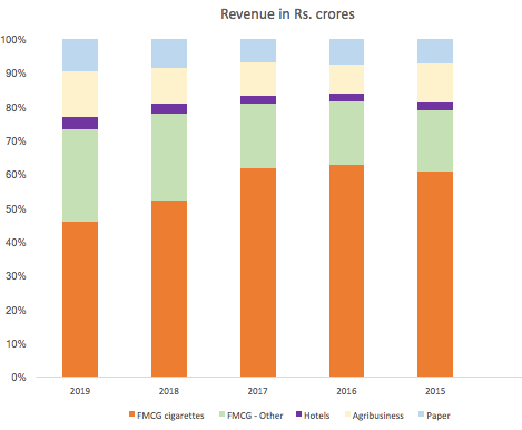 While these days ITC’s top brass rarely talks about tobacco, it’s the cigarette business that is actually keeping the wheels turning. The segment’s contribution to earnings* remains comparable to 2015 levels, although its share in revenue has fallen from ~60% in 2015 to 48% in 2019.