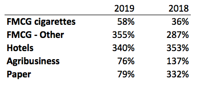 In recent years, ITC has been disinvesting in cigarettes — the asset investment ratio (CAPEX to Depreciation) for the segment is a lousy 58% in 2019. This exemplifies that the company is looking for growth outside of cigarettes — mostly in the other FMCG business segment.